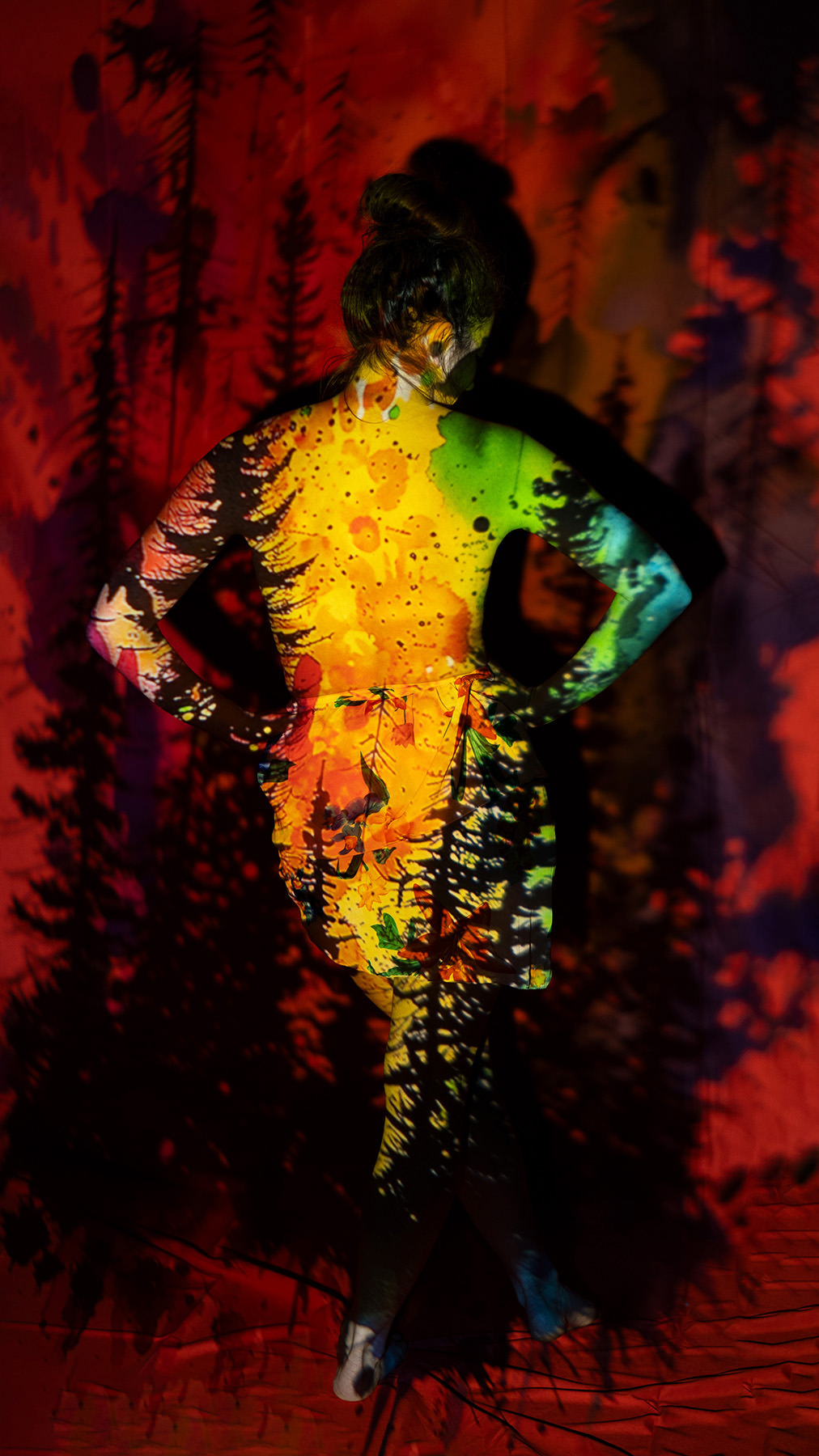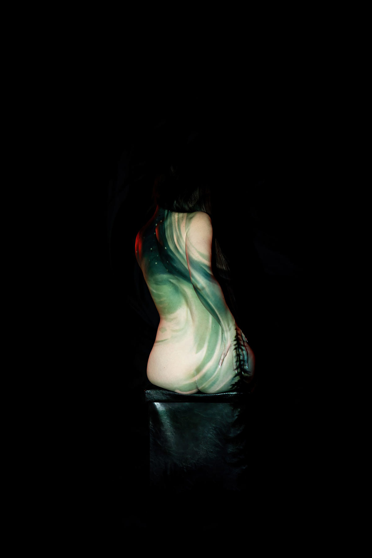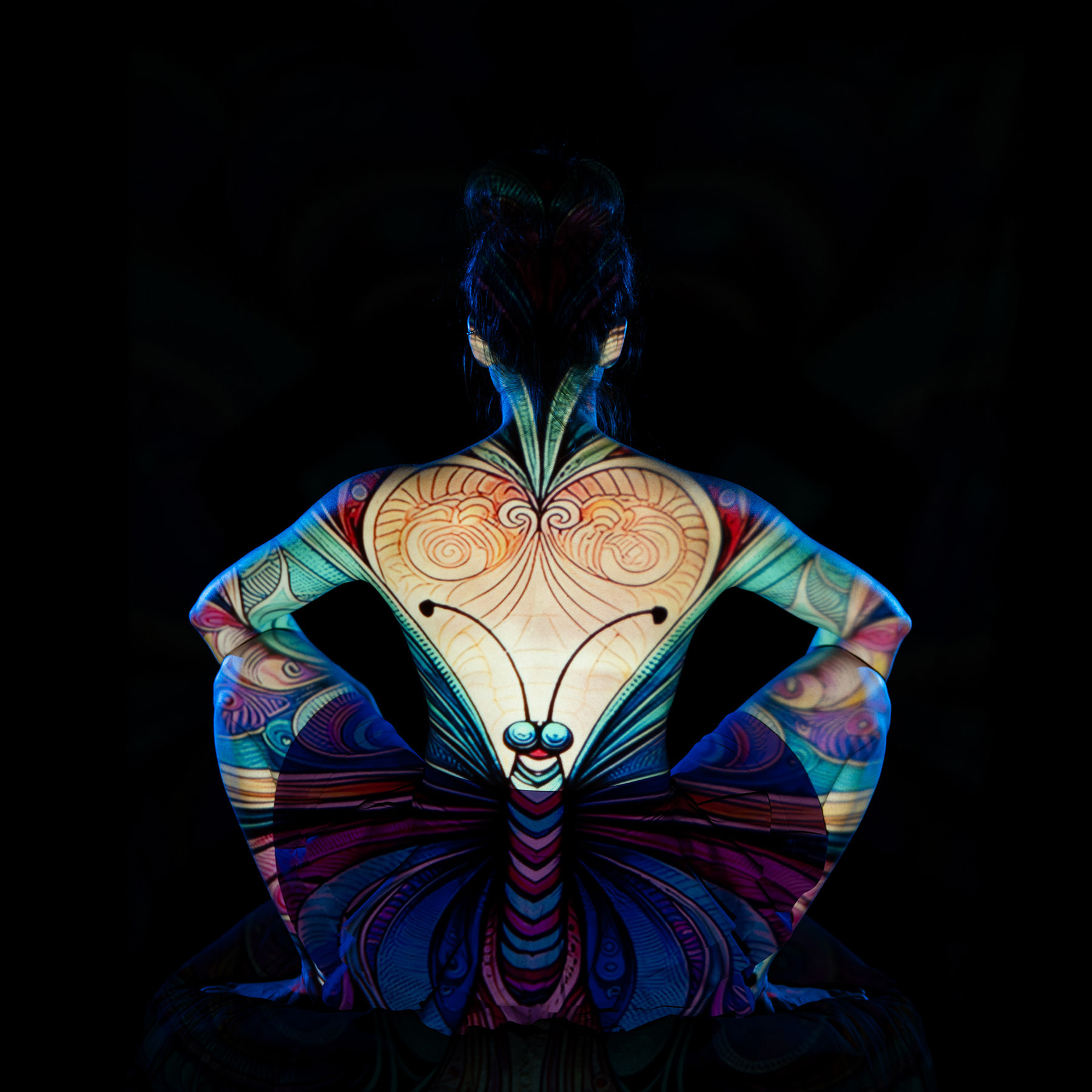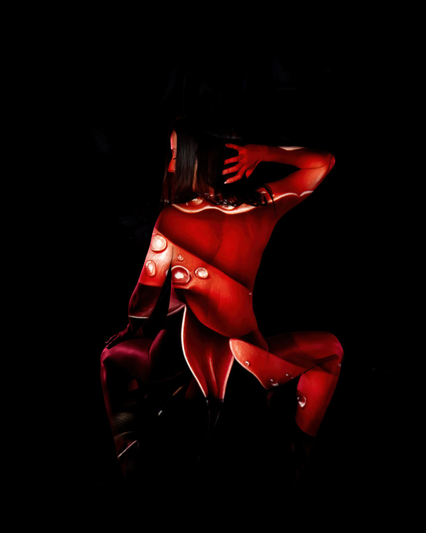 Body paint, evolved. Back projection photography at its finest — skip the mess and step into the light. Using a specialized multi-projector setup and custom-coded software, we wrap your form in digital textures, light, and motion.